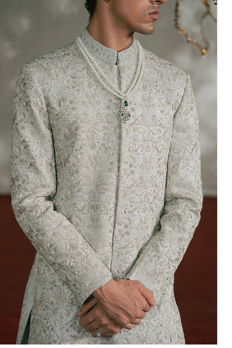 A sand grey embroidered jamawar sherwani richly adorned with timeless floral motifs, with fine resham threadwork, shimmering sequins, and delicate katdana detailing. Detailed with hand-embroidered floral band collar and composed sleeves.