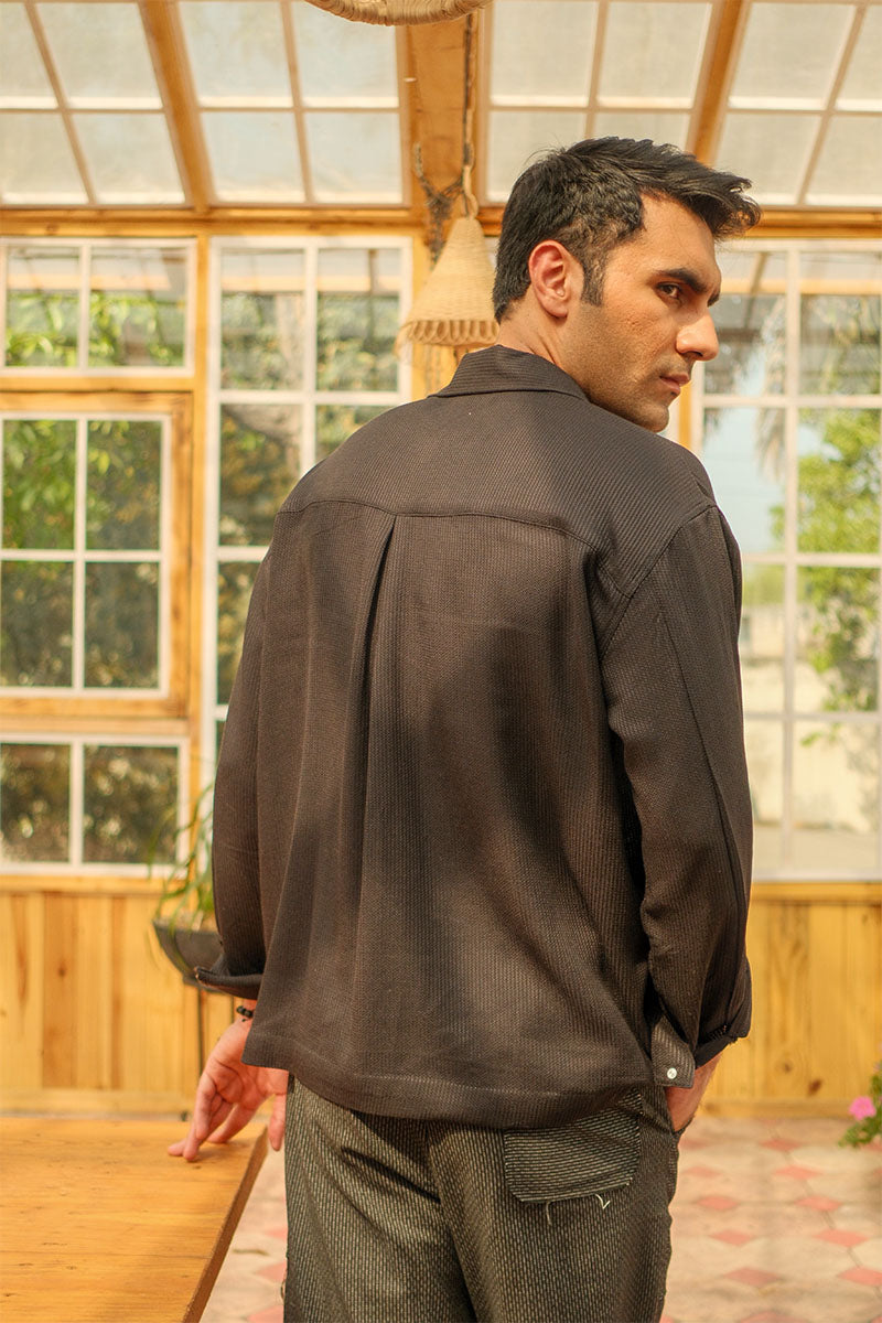 Gray textured slub cotton shorts with exaggerated front patch pockets .