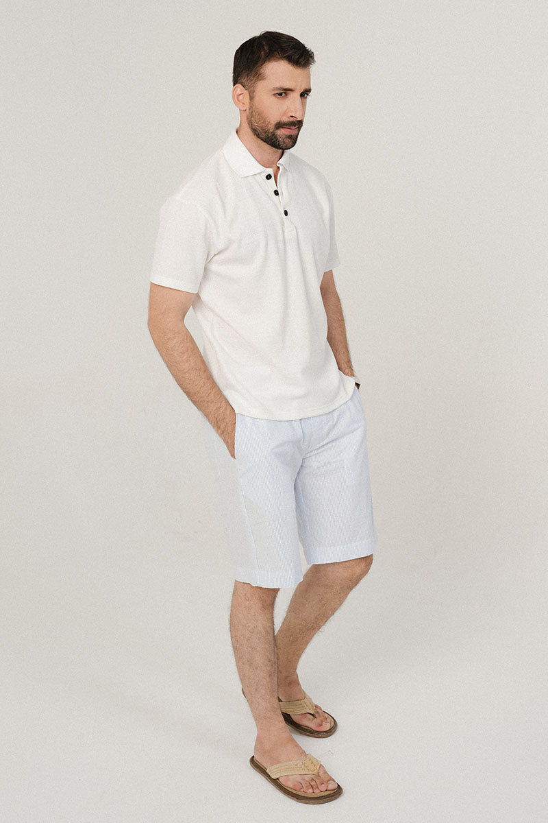 Sky blue cotton short with draw string fastening and partially elasticated belt at the back.