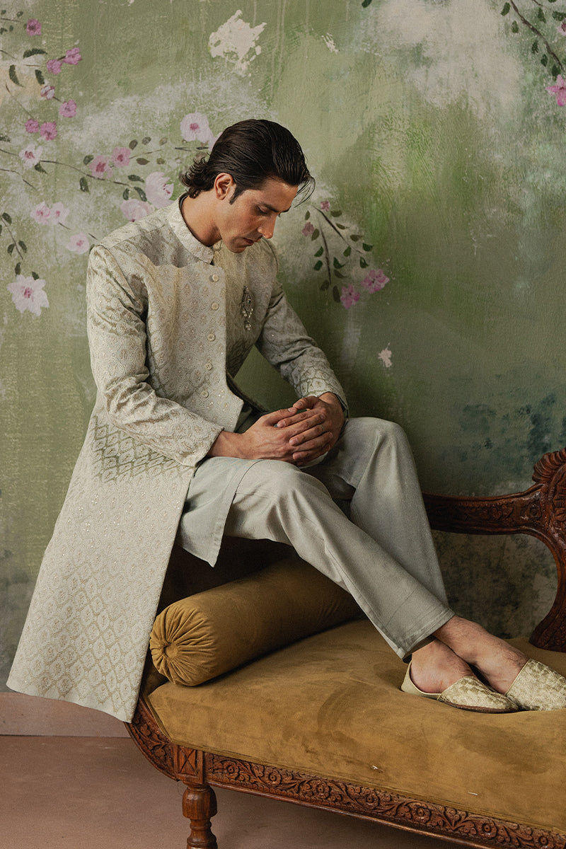 Sage green embroidered sherwani adorned with all-over cross-stitch geometric pattern, crafted from rich Jamawar fabric.